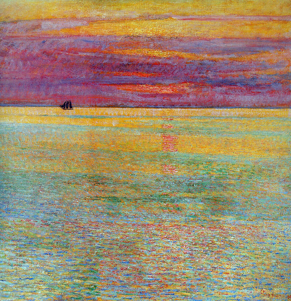 Ti offriamo una riproduzione artigianale su tela dell'opera famosa 'Tramonto in mare' di Childe Hassam, dal Museo delle Riproduzioni.