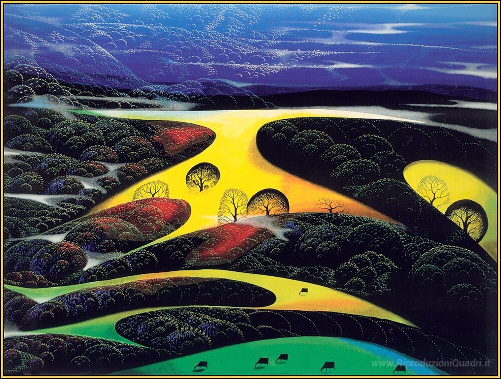 Scopri l'incanto di Tramonto magico, un'opera straordinaria dell'artista Eyvind Earle, celebre per il suo stile distintivo e poetico. Earle, maestro della pittura a olio, combina abilmente elementi naturalistici con una visione onirica, dando vita a paesaggi che evocano emozioni profonde e un senso di meraviglia. Ogni pennellata racconta una storia, regalando agli osservatori un’opportunità unica di immergersi in atmosfere incantate.