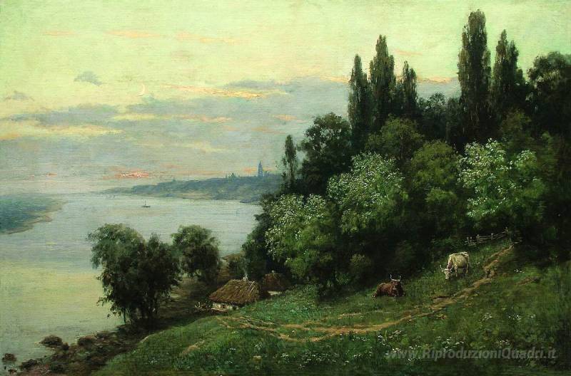 Ti offriamo una riproduzione artigianale su tela dell'opera famosa 'Tramonto sul fiume' di Volodymyr Orlovsky, dal Museo delle Riproduzioni.