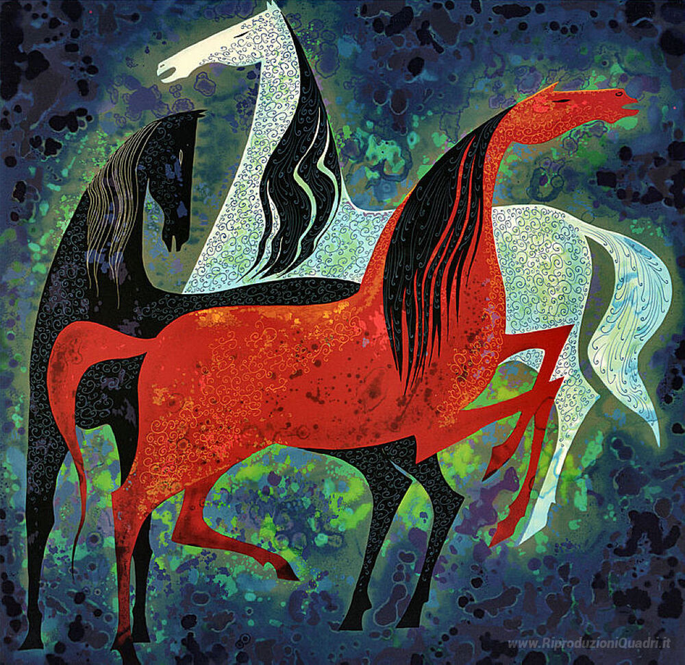 Ti offriamo una riproduzione artigianale su tela dell'opera famosa 'Tre nobili cavalli' di Eyvind Earle, dal Museo delle Riproduzioni.