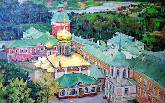 Ti offriamo una riproduzione artigianale su tela dell'opera famosa 'Troitsky Cathederal in Troitse-Sergiyev Monastero' di Konstantin Yuon, dal Museo delle Riproduzioni.