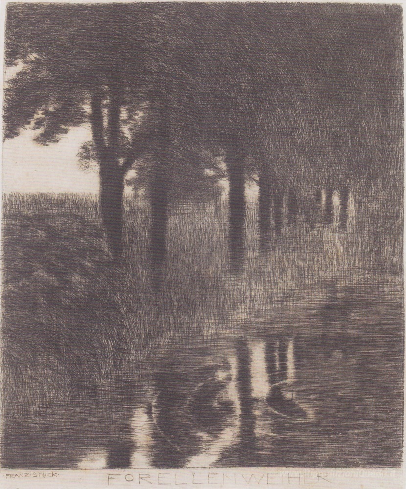 Ti offriamo una riproduzione artigianale su tela dell'opera famosa 'Trout Pond' di Franz Stuck, dal Museo delle Riproduzioni.