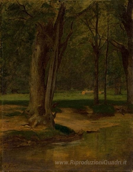 Scoprite l'incanto dei dipinti a olio italiani con opere straordinarie come Trout Stream, North Conway di George Inness, un maestro dell'impressionismo americano. Questa opera rappresenta una fusione di emozione e natura, catturando con sapiente maestria la serenità di un paesaggio fluviale. Inness, noto per il suo approccio poetico alla luce e al colore, utilizza tecniche innovative che esaltano i dettagli di un'atmosfera tranquilla e meditativa.