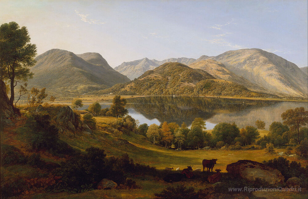 Ti offriamo una riproduzione artigianale su tela dell'opera famosa 'Ullswater, prime ore del mattino' di John Glover, dal Museo delle Riproduzioni.