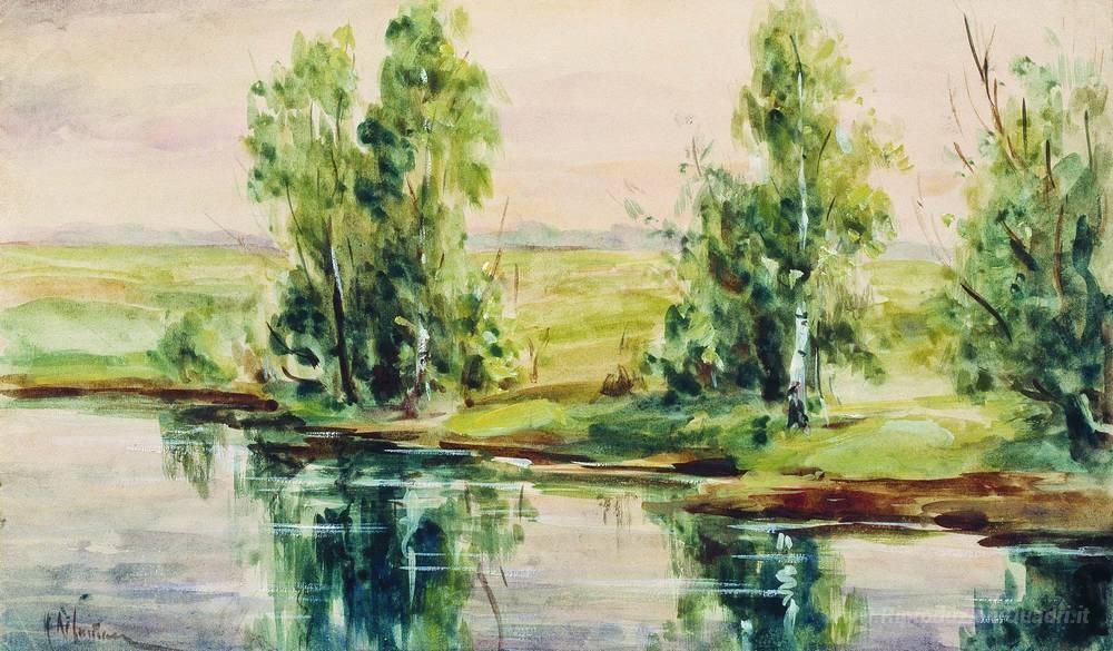 Ti offriamo una riproduzione artigianale su tela dell'opera famosa 'Un fiume' di Isaac Levitan, dal Museo delle Riproduzioni.