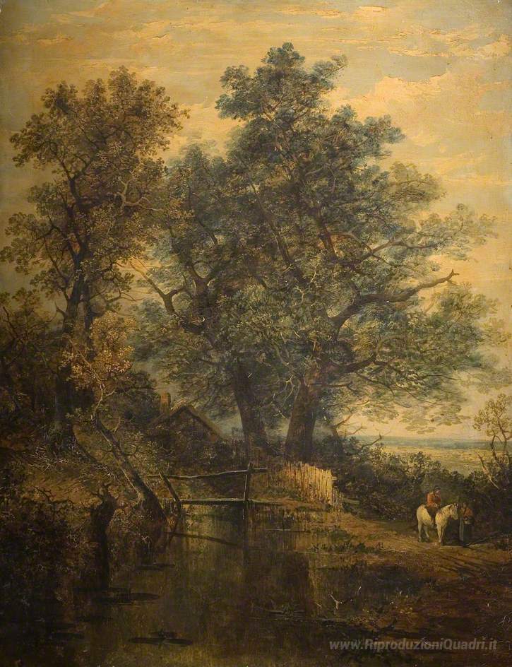 Ti offriamo una riproduzione artigianale su tela dell'opera famosa 'Un flusso, Ponte, alberi e due figure in un paesaggio' di John Crome, dal Museo delle Riproduzioni.