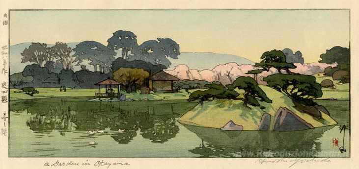 Ti offriamo una riproduzione artigianale su tela dell'opera famosa 'Un Giardino a Okayama' di Hiroshi Yoshida, dal Museo delle Riproduzioni.