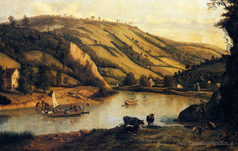 Ti offriamo una riproduzione artigianale su tela dell'opera famosa 'Un paesaggio del fiume esteso, probabilmente Derbyshire, con Dro' di Jan Siberechts, dal Museo delle Riproduzioni.
