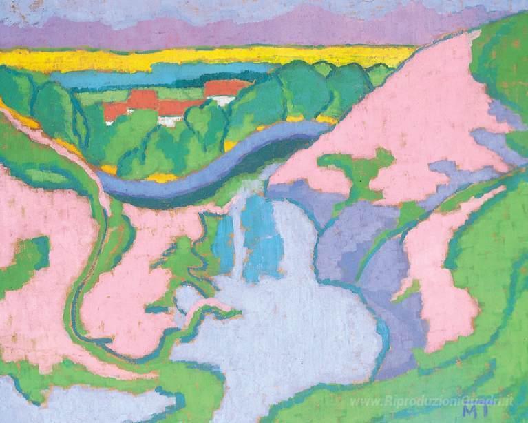 Ti offriamo una riproduzione artigianale su tela dell'opera famosa 'Un paesaggio di Brasov' di Janos Mattis-Teutsch, dal Museo delle Riproduzioni.