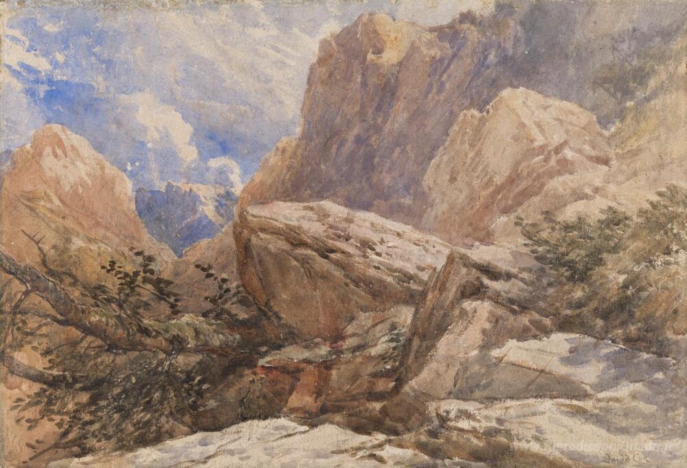 Ti offriamo una riproduzione artigianale su tela dell'opera famosa 'Un paesaggio di montagna' di David Cox, dal Museo delle Riproduzioni.