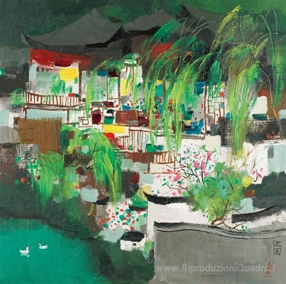 Lo stile distintivo di Wu Guanzhong si basa su una trama vibrante di colori e forme, dove la tecnica dell’olio offre una resa luminosa e dinamica. Un sogno di Shen Garden è un esempio perfetto della sua maestria, capace di trasmettere un'atmosfera di serenità e contemplazione. Questo dipinto non solo arricchisce qualsiasi ambiente con l'eleganza dei suoi toni, ma invita anche l’osservatore a un viaggio interiore, trasformando lo spazio in un luogo di riflessione e bellezza.