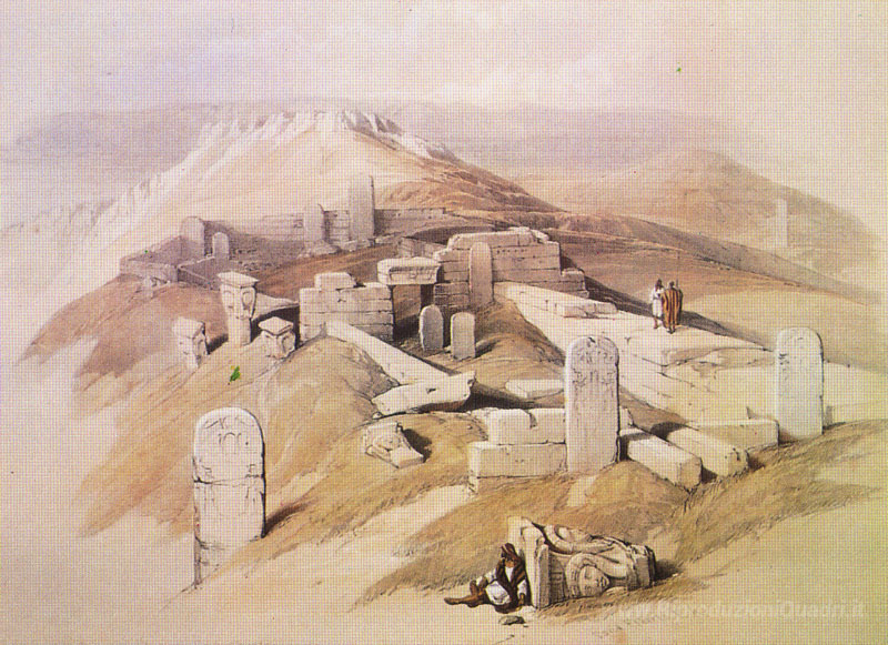 Ti offriamo una riproduzione artigianale su tela dell'opera famosa 'Un tempio egiziano antico, il Gebel Garaba' di David Roberts, dal Museo delle Riproduzioni.