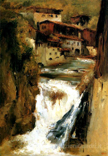 Ti offriamo una riproduzione artigianale su tela dell'opera famosa 'Una cascata in Thiers' di Theodore Rousseau, dal Museo delle Riproduzioni.