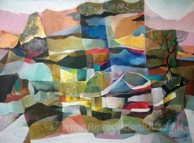 Ti offriamo una riproduzione artigianale su tela dell'opera famosa 'Untitled (Paesaggio)' di Vicente Manansala, dal Museo delle Riproduzioni.