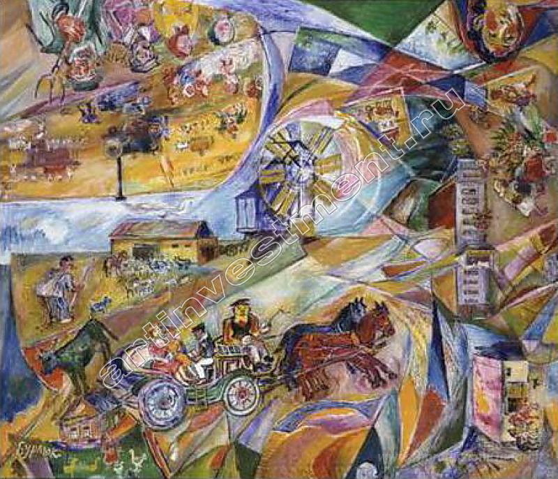Questo dipinto, con il suo stile unico e dettagliato, rappresenta un'interpretazione suggestiva di un villaggio, capace di trasformare qualsiasi spazio in un luogo di contemplazione e bellezza. La maestria tecnica di Burliuk nell'uso della pittura a olio non solo arricchisce l'ambiente, ma stimola anche la creatività e l'ispirazione di chi lo osserva, rendendolo un'aggiunta perfetta per ogni collezione d'arte raffinata.