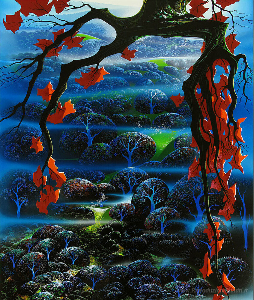 Ti offriamo una riproduzione artigianale su tela dell'opera famosa 'Valle dei Sogni' di Eyvind Earle, dal Museo delle Riproduzioni.