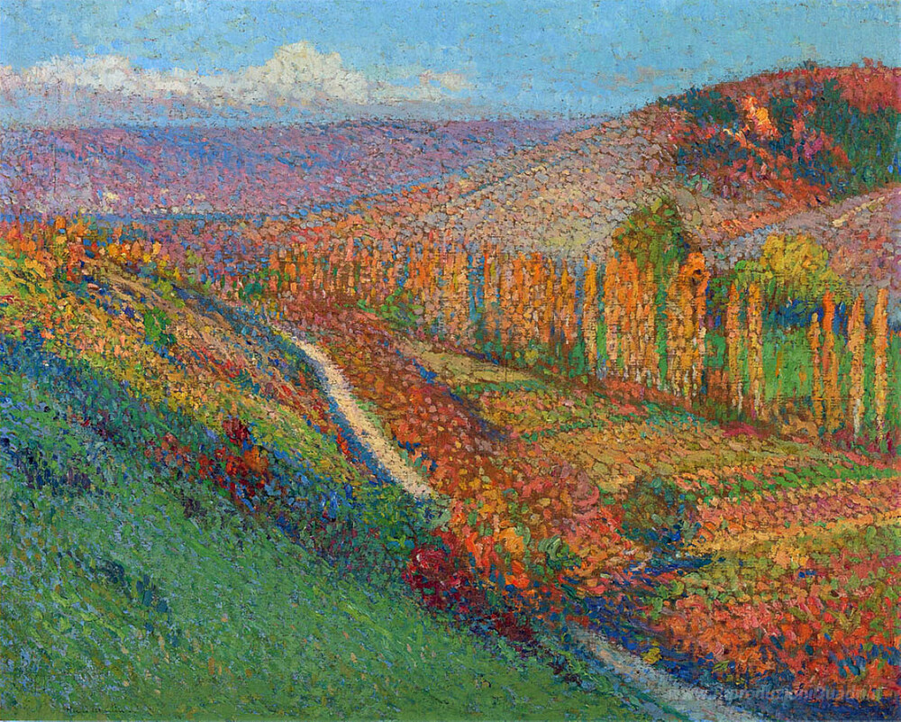 Ti offriamo una riproduzione artigianale su tela dell'opera famosa 'Valle verde con Stream' di Henri Martin, dal Museo delle Riproduzioni.