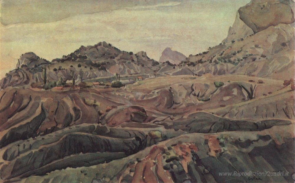 Ti offriamo una riproduzione artigianale su tela dell'opera famosa 'Veduta di dintorni di Sudak' di Konstantin Bogaevsky, dal Museo delle Riproduzioni.