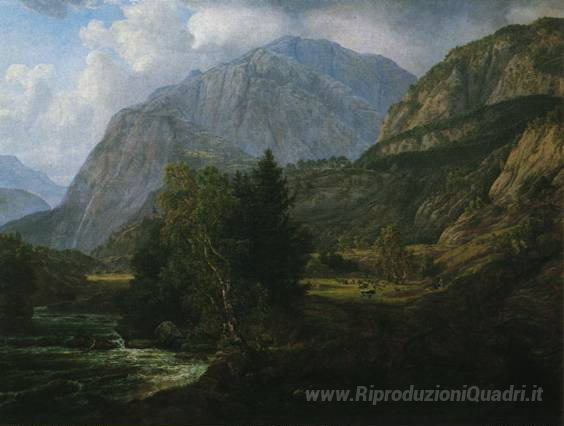 Ti offriamo una riproduzione artigianale su tela dell'opera famosa 'Veduta di Fortundalen' di Johan Christian Dahl, dal Museo delle Riproduzioni.