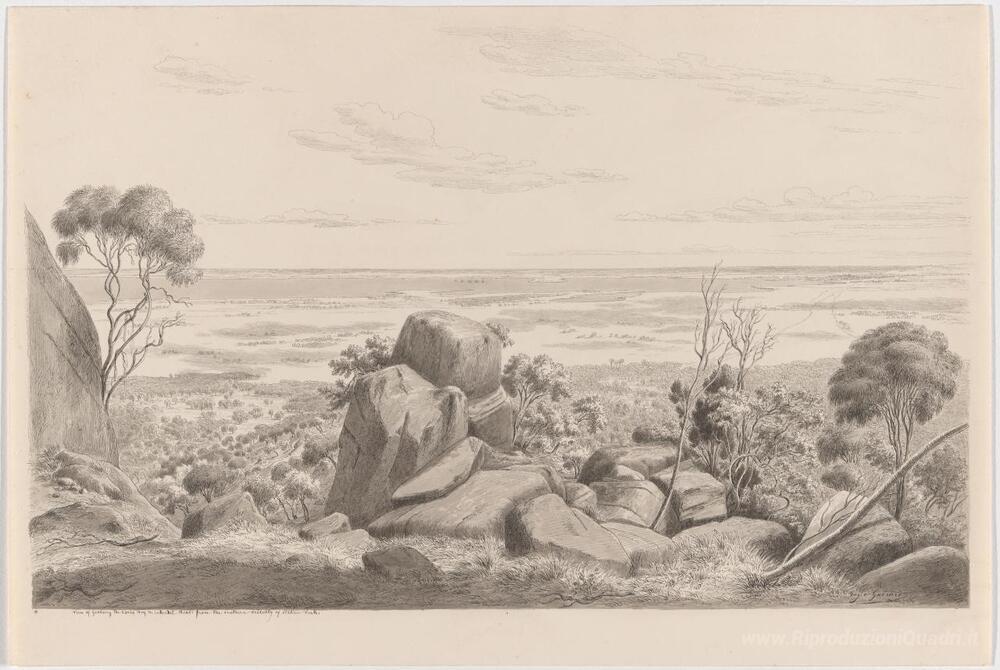 Ti offriamo una riproduzione artigianale su tela dell'opera famosa 'Veduta di Geelong, il Corio Bay e teste rientrati dal declivio m' di Eugene von Guerard, dal Museo delle Riproduzioni.