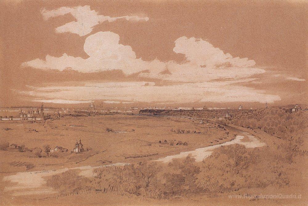 Ti offriamo una riproduzione artigianale su tela dell'opera famosa 'Veduta di Mosca da Sparrow Hills' di Aleksey Savrasov, dal Museo delle Riproduzioni.