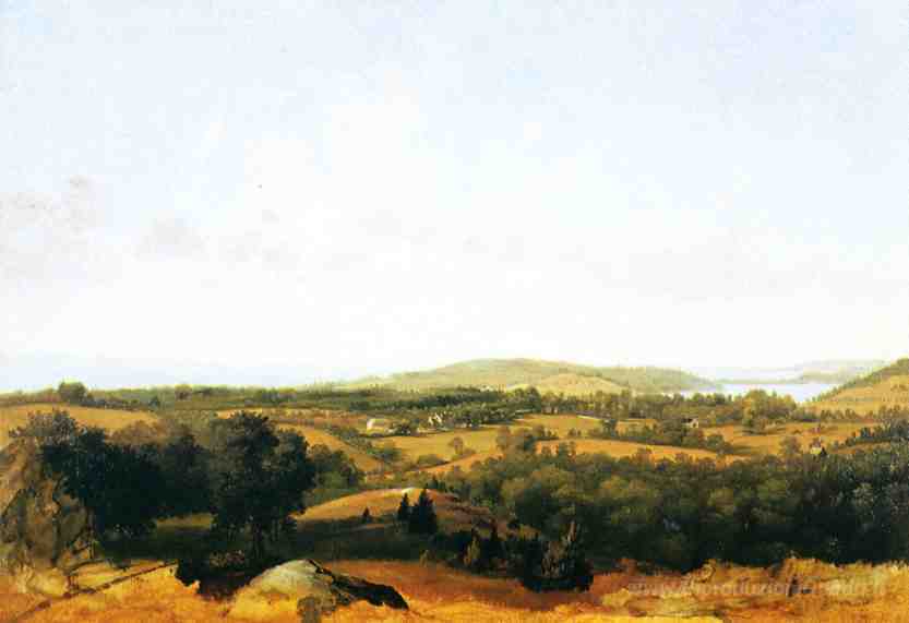 Ti offriamo una riproduzione artigianale su tela dell'opera famosa 'Veduta di Narragansett Bay vicino a Warwick, Rhode Island' di David Johnson, dal Museo delle Riproduzioni.
