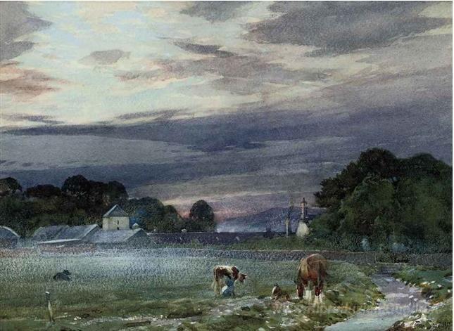 Ti offriamo una riproduzione artigianale su tela dell'opera famosa 'Veduta di Philiphaugh Farm, Selkirk all'alba' di Tom Scott, dal Museo delle Riproduzioni.