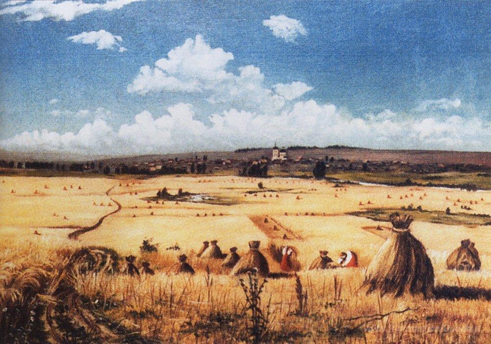 Ti offriamo una riproduzione artigianale su tela dell'opera famosa 'Vendemmia' di Ivan Shishkin, dal Museo delle Riproduzioni.