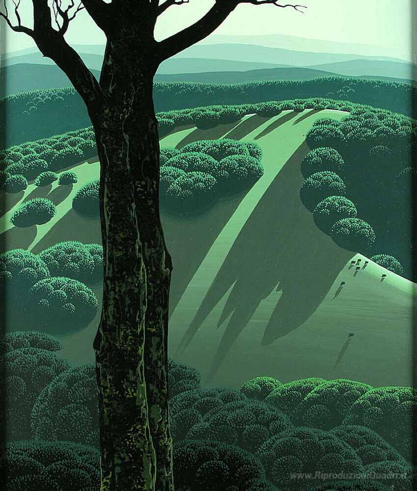 Ti offriamo una riproduzione artigianale su tela dell'opera famosa 'Verde Hillside' di Eyvind Earle, dal Museo delle Riproduzioni.