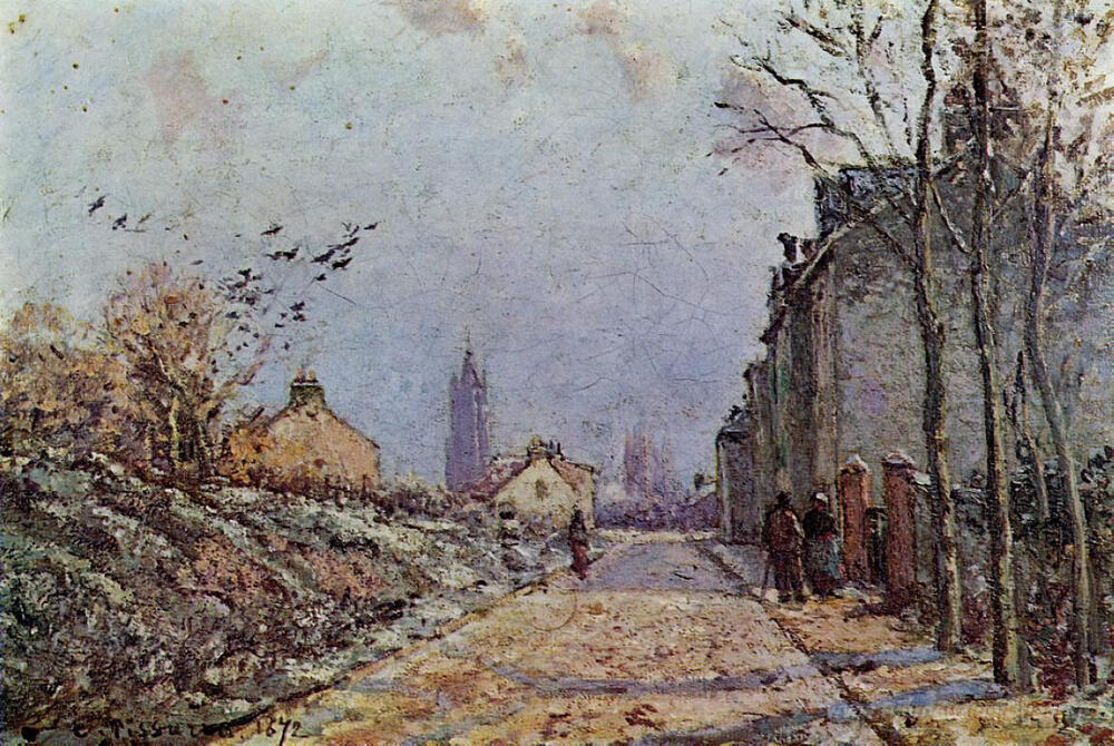 Ti offriamo una riproduzione artigianale su tela dell'opera famosa 'Via Effetto Neve' di Camille Pissarro, dal Museo delle Riproduzioni.