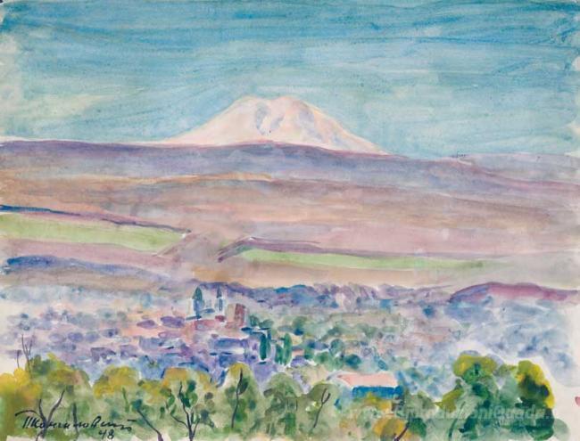 Ti offriamo una riproduzione artigianale su tela dell'opera famosa 'View of Elbrus' di Pyotr Konchalovsky, dal Museo delle Riproduzioni.