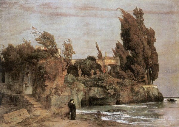 Ti offriamo una riproduzione artigianale su tela dell'opera famosa 'Villa by the Sea' di Arnold Böcklin, dal Museo delle Riproduzioni.