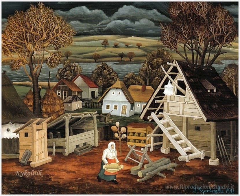 Ti offriamo una riproduzione artigianale su tela dell'opera famosa 'Village cortile' di Ivan Generalic, dal Museo delle Riproduzioni.