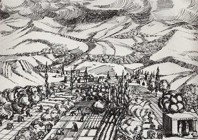 Ti offriamo una riproduzione artigianale su tela dell'opera famosa 'Villaggio armeno' di Martiros Saryan, dal Museo delle Riproduzioni.