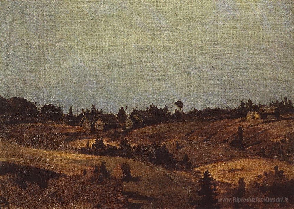 Ti offriamo una riproduzione artigianale su tela dell'opera famosa 'Villaggio Monte Okulova' di Vasily Polenov, dal Museo delle Riproduzioni.