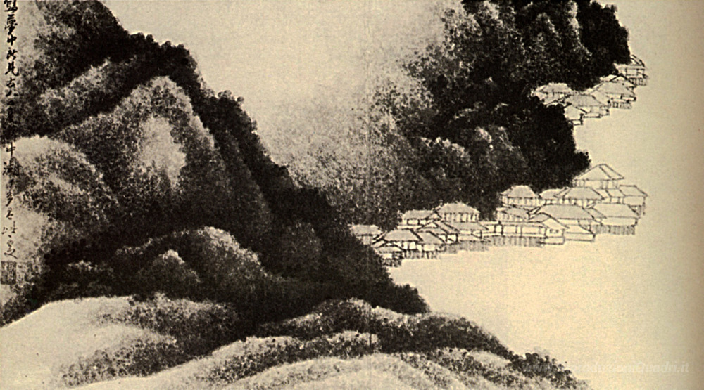Ti offriamo una riproduzione artigianale su tela dell'opera famosa 'Villaggio sull'acqua' di Shitao, dal Museo delle Riproduzioni.