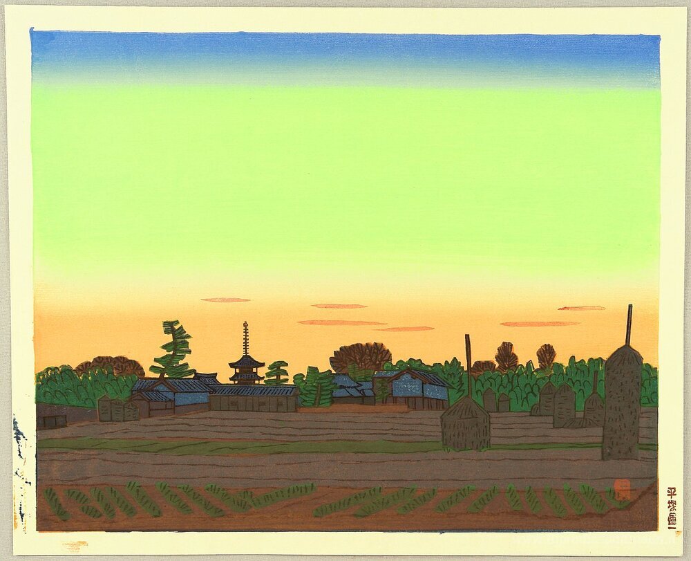 Ti offriamo una riproduzione artigianale su tela dell'opera famosa 'Villege di Tempio di Horyu nel colore Sunset' di Unichi Hiratsuka, dal Museo delle Riproduzioni.