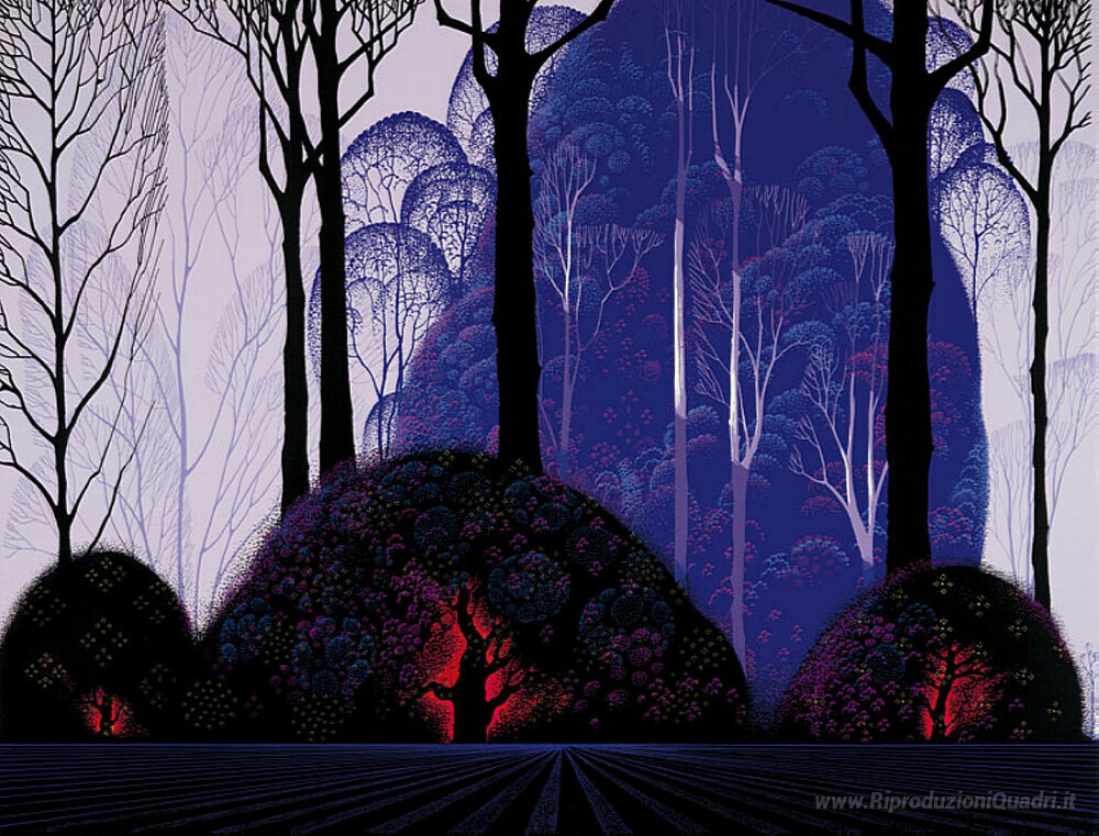 Ti offriamo una riproduzione artigianale su tela dell'opera famosa 'Viola Eucalyptus' di Eyvind Earle, dal Museo delle Riproduzioni.
