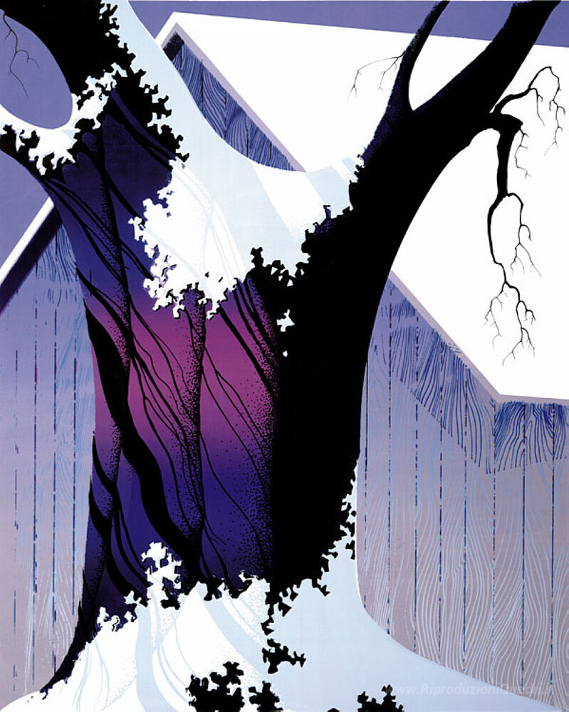 Ti offriamo una riproduzione artigianale su tela dell'opera famosa 'Violet Albero e Barn' di Eyvind Earle, dal Museo delle Riproduzioni.