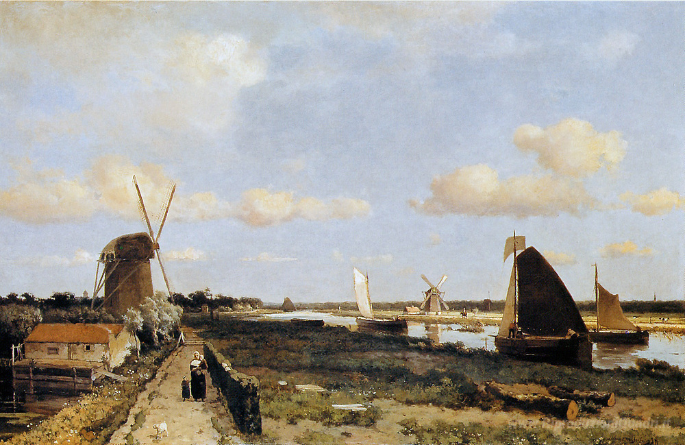 Ti offriamo una riproduzione artigianale su tela dell'opera famosa 'Vista a Geestbrug' di Johan Hendrik Weissenbruch, dal Museo delle Riproduzioni.