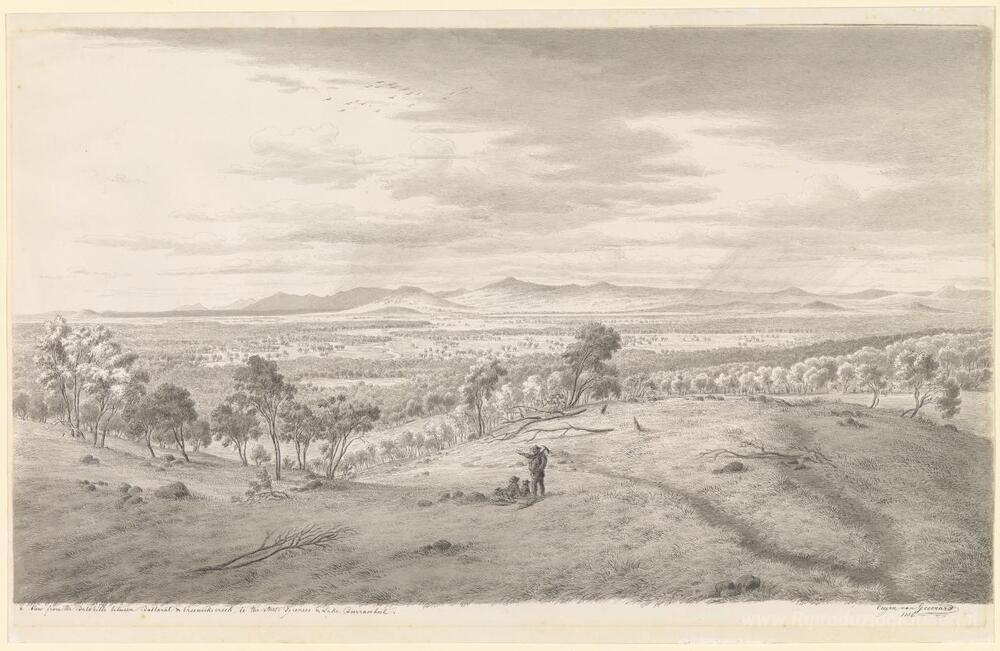 Ti offriamo una riproduzione artigianale su tela dell'opera famosa 'Vista dal Bald colline tra Ballarat e Creswick Creek, ai Pirenei' di Eugene von Guerard, dal Museo delle Riproduzioni.