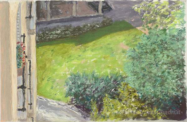 Ti offriamo una riproduzione artigianale su tela dell'opera famosa 'Vista del giardino dalla cucina Balcone (Piazza de Port-Royal)' di Avigdor Arikha, dal Museo delle Riproduzioni.