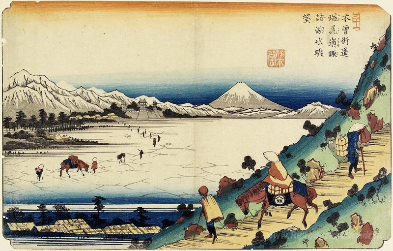 Ti offriamo una riproduzione artigianale su tela dell'opera famosa 'Vista del Lago Suwa come visto da Shiojiri Passo' di Keisai Eisen, dal Museo delle Riproduzioni.