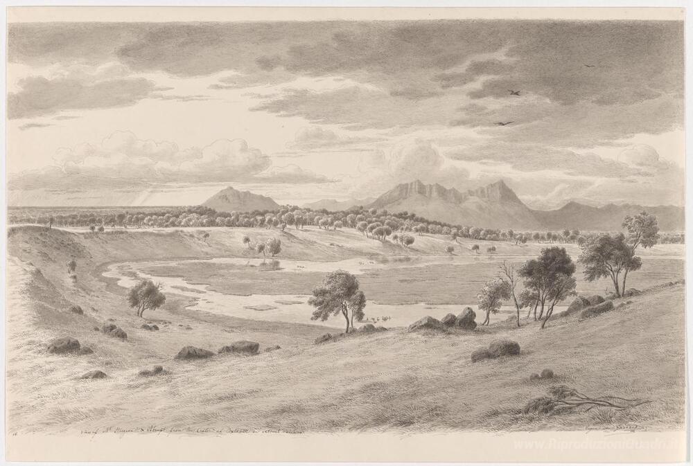 Ti offriamo una riproduzione artigianale su tela dell'opera famosa 'Vista del Monte Sturgeon e brusco dal cratere di Bald Hill, un v' di Eugene von Guerard, dal Museo delle Riproduzioni.
