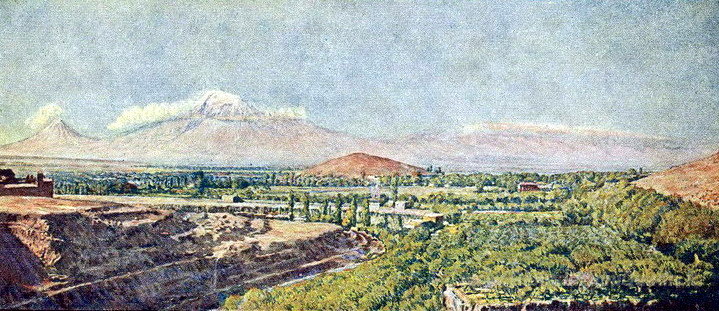 Ti offriamo una riproduzione artigianale su tela dell'opera famosa 'Vista della valle Ararat' di Ilya Mashkov, dal Museo delle Riproduzioni.