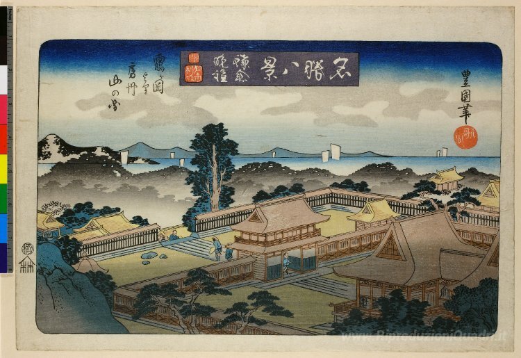Ti offriamo una riproduzione artigianale su tela dell'opera famosa 'Vista delle montagne di Awa Province Tsurugaoka, nei pressi di K' di Utagawa Toyokuni II, dal Museo delle Riproduzioni.