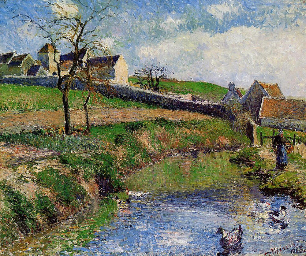 Ti offriamo una riproduzione artigianale su tela dell'opera famosa 'Vista di una fattoria a Osny' di Camille Pissarro, dal Museo delle Riproduzioni.