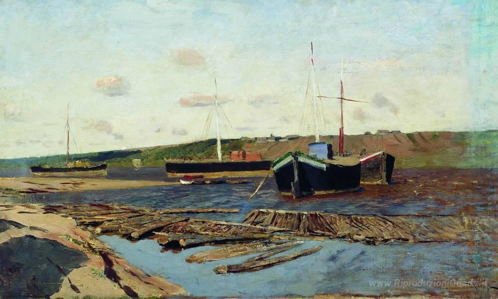 Ti offriamo una riproduzione artigianale su tela dell'opera famosa 'Volga. Chiatte.' di Isaac Levitan, dal Museo delle Riproduzioni.