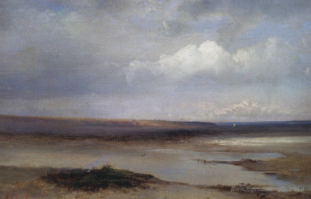 Ti offriamo una riproduzione artigianale su tela dell'opera famosa 'Volga' di Aleksey Savrasov, dal Museo delle Riproduzioni.