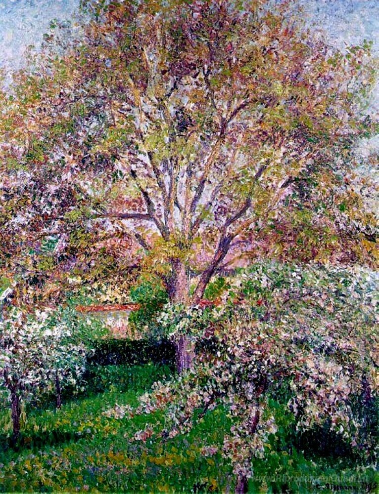 Ti offriamo una riproduzione artigianale su tela dell'opera famosa 'Wallnut e meli in fiore a Eragny' di Camille Pissarro, dal Museo delle Riproduzioni.